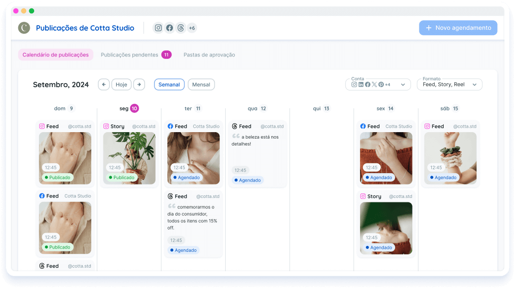 Centralize a gestão e agendamento de postagens do: Instagram, Facebook, Threads, YouTube, LinkedIn, Pinterest, Google Meu Negócio e outros canais, tudo em um só lugar.