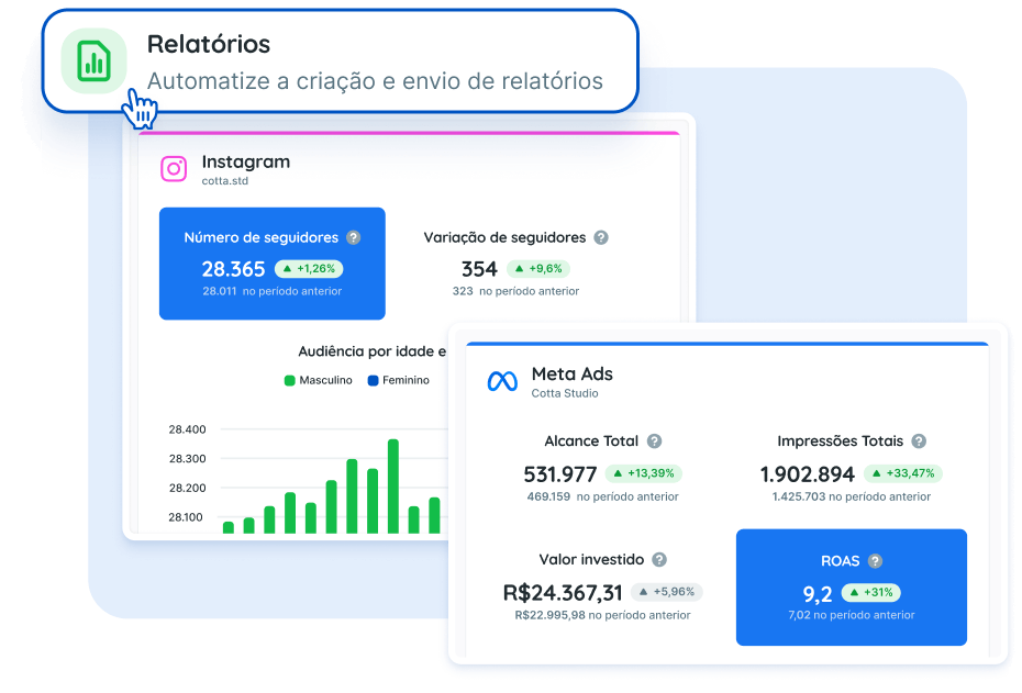 Configure suas automações e deixe que o Reportei trabalhe por você