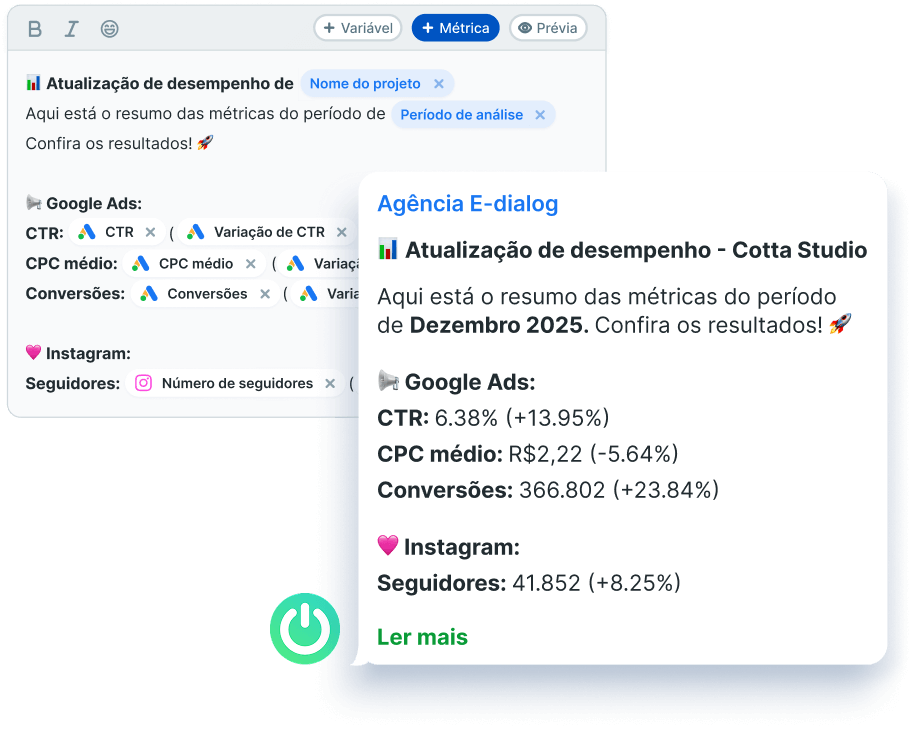 Nem sempre é preciso um relatório completo. Com a automação de resumos, você pode enviar mensagens curtas e diretas com as métricas mais importantes, perfeitas para atualizações rápidas e acompanhamento contínuo de resultados.