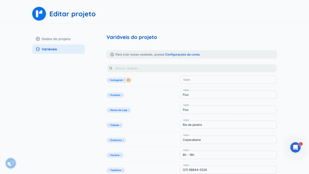Configurações do projeto: permite criar ou editar as variáveis específicas do projeto