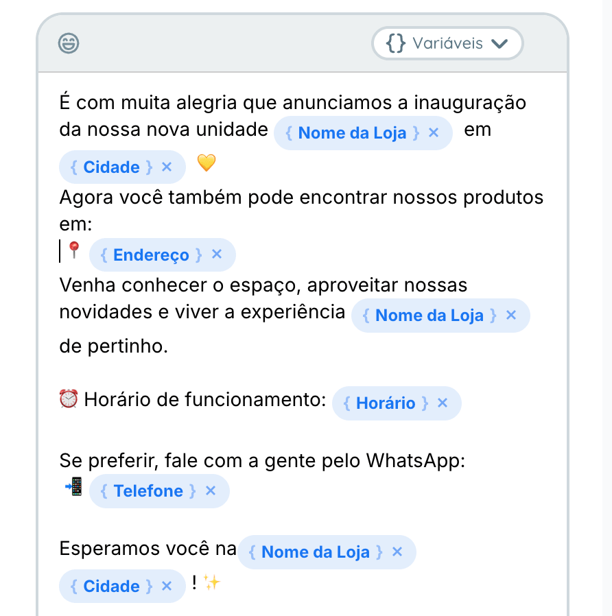 Exemplo: usuário cria a seguinte legenda: “Venha conhecer nossa unidade em [cidade]! Agende pelo número [telefone].”