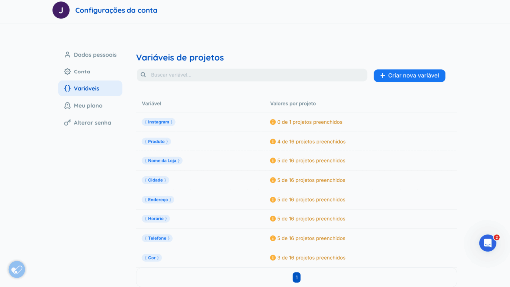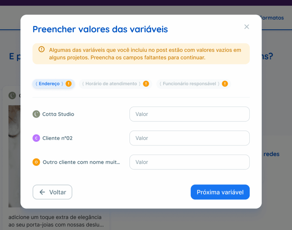 Será possível criar novas variáveis nos seguintes locais: Configurações da conta, Configurações do projeto e no próprio seletor de variáveis (ao criar a legenda de um post).