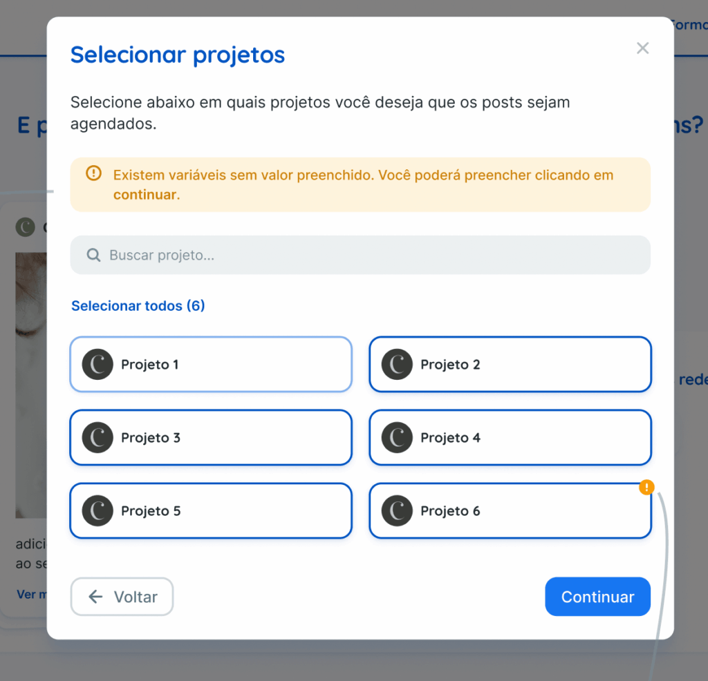 Ao clonar um post que contém variáveis, o sistema substituirá automaticamente os valores conforme o projeto de destino selecionado. Assim, será possível replicar uma campanha padronizada para múltiplas unidades/franqueados, mantendo a personalização correta de cada uma.