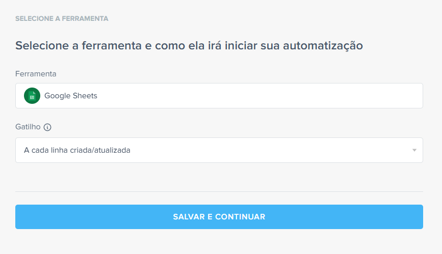 Na página inicial da Pluga, clique em “Criar automatização”. Escolha o Google Sheets como ferramenta de origem e selecione o gatilho desejado: