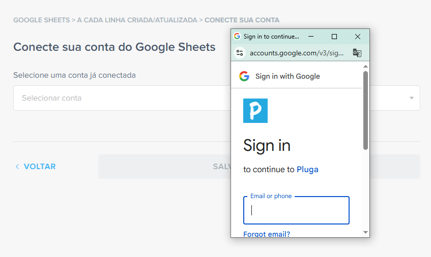 Clique em “Conectar nova conta” e autorize a Pluga a acessar suas planilhas do Google Sheets. O processo é seguro e você pode gerenciar as permissões a qualquer momento.