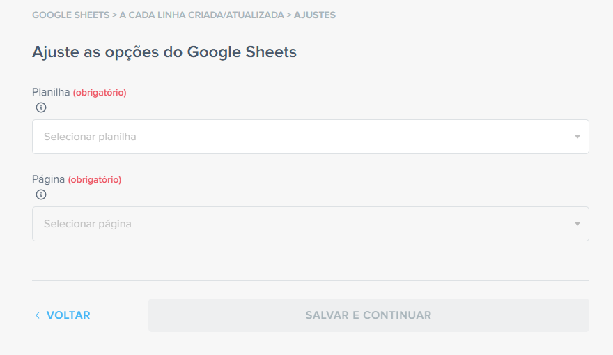 Selecione a planilha e a página (aba) que será usada como gatilho para a automação. A Pluga vai monitorar essa planilha e disparar a criação do relatório sempre que houver uma nova linha ou atualização.