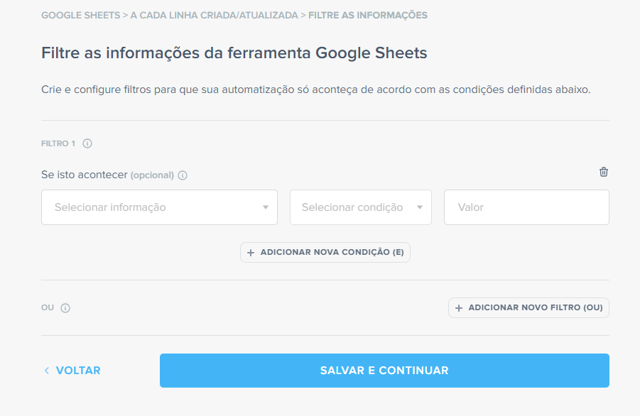 Se não precisar de filtros, basta clicar em “Salvar e continuar” para avançar.