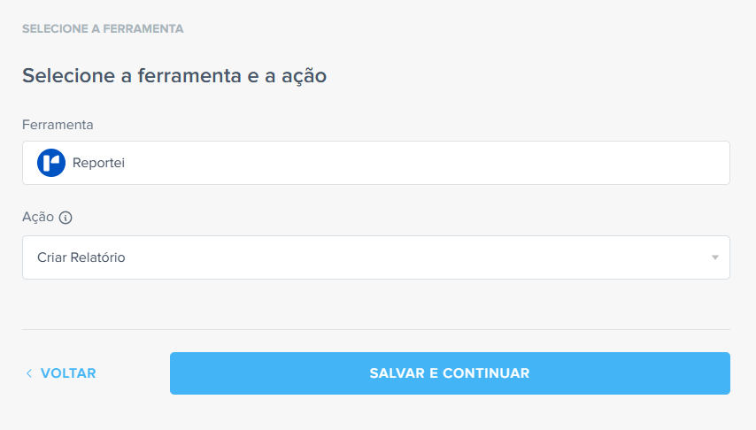 Em seguida, selecione o Reportei como ferramenta de destino e escolha a ação “Criar Relatório”.