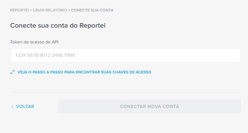Para conectar o Reportei à Pluga, você precisará do Token de acesso da API. Esse token é encontrado dentro da sua conta do Reportei.