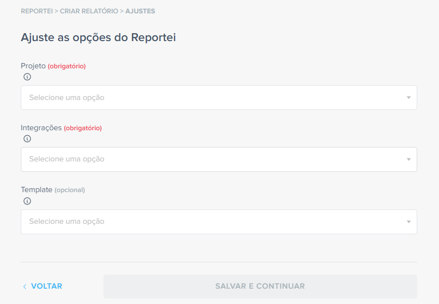 Selecione o projeto e a integração conectada ao projeto onde o relatório será criado. Você também pode escolher um template pré-definido para estruturar seu relatório automaticamente.