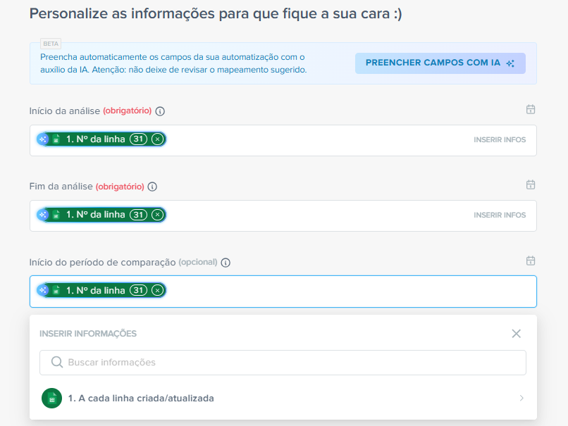 Importante: Você pode usar o recurso “Preencher campos com IA” para mapear automaticamente os campos, mas sempre revise o mapeamento sugerido para garantir que está correto.