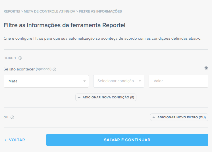 Se não precisar de filtros, basta clicar em “Salvar e continuar” para avançar.