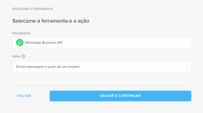 Selecione o “WhatsApp Business API” como ferramenta de destino, que receberá as informações a cada vez que o gatilho anterior for acionado. Além disso, selecione a ação “Enviar mensagem a partir de um modelo”.
