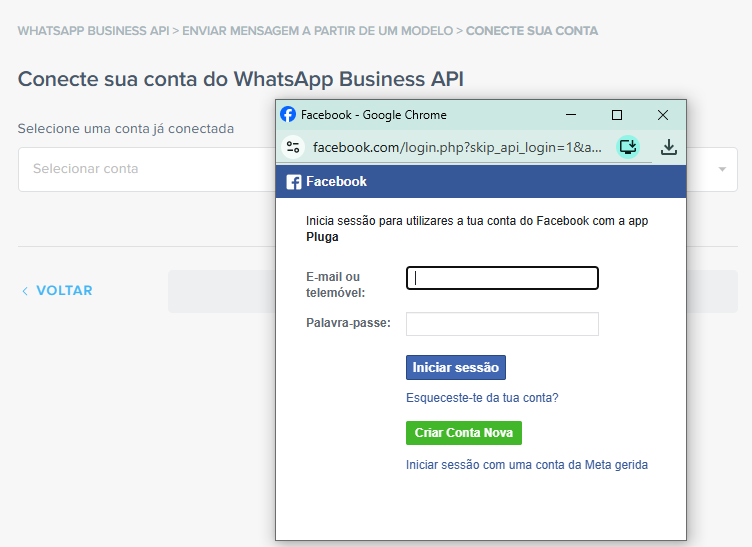 Clique em “Conectar nova conta” e forneça as credenciais necessárias para autorizar a Pluga a enviar mensagens através da sua conta do WhatsApp Business API. As credenciais necessárias variam de acordo com o provedor de API que você utiliza.
