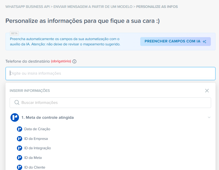 Importante: Como o Reportei não fornece atributos de telefone nas variáveis disponíveis, você precisará inserir um número fixo — por exemplo, o número do cliente que deseja notificar sempre que a meta for atingida.
