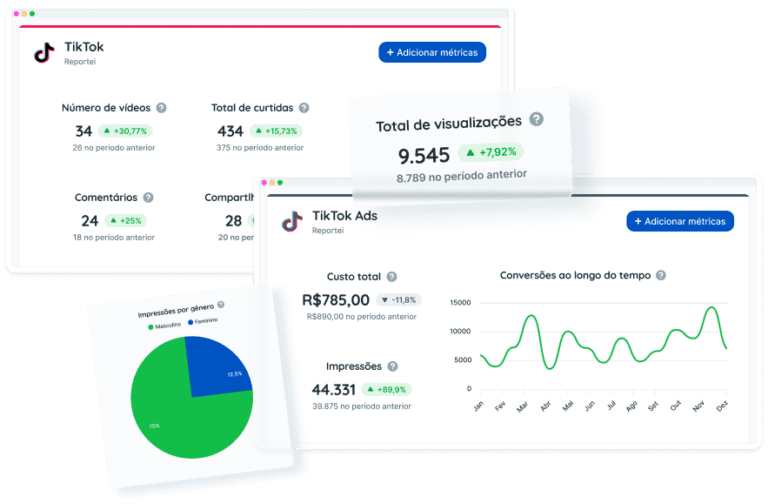 Ao integrar sua conta do TikTok, você consegue gerar relatórios e dashboards automaticamente em poucos segundos, sem precisar coletar métricas manualmente.