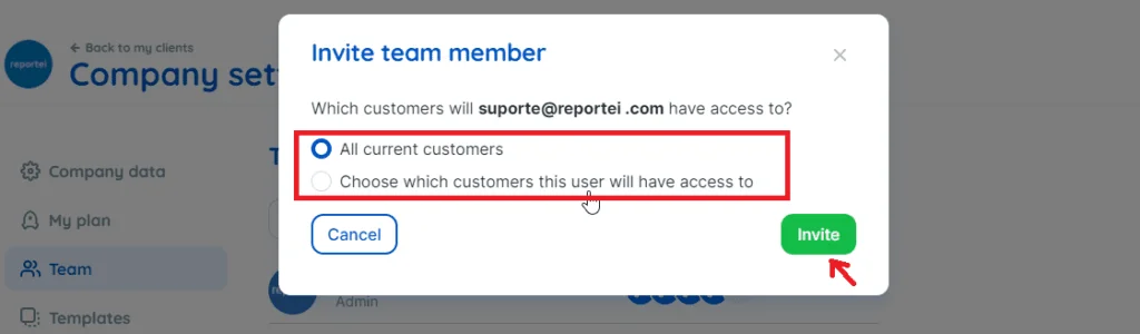 Once that’s done, you’ll go to the page where you can invite and manage the users who have access to your Reportei account. To invite a person to your team just add the email and click to “Invite”.