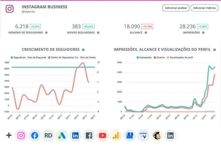 With your profile linked to a Facebook page, adding a commercial Instagram account to Reportei is easy to do.  It will also give you more options for analyzing your stats in detail.