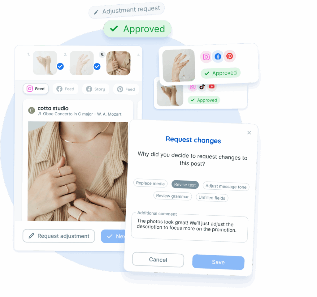 Facilite o processo de revisão e aprovação de posts com um fluxo centralizado, onde toda a comunicação e feedback ficam registrados em um só lugar.