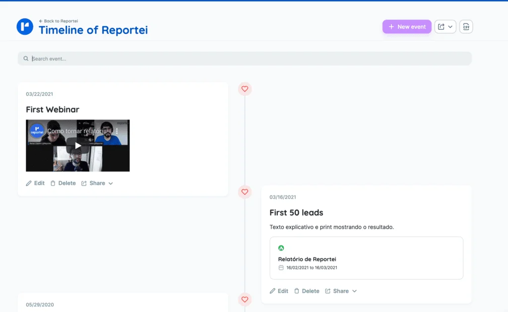 Although not new to Reportei version 4.0, the Timeline gained the new look of the platform and is increasingly standing out as a way to create a project history and use storytelling techniques when reporting to the client all milestones of this partnewhat can fill it inlled in every time a new event happens and shared so that the client can follow the evolution of the results . See some examples: