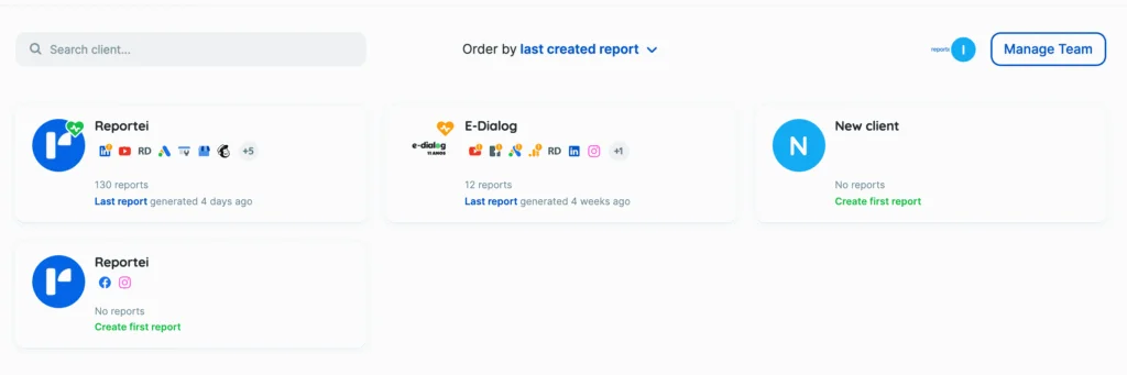 Right away, anyone who already has access to Reportei 4.0 is faced with a significant change: the new interface, which, in addition to being cleaner and – modesty – beautiful, facilitates browsing through customer accounts and the features available in the software.