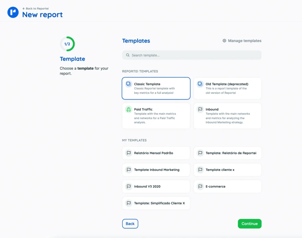 Just choose your template — the classic model, the old one (available in version 3.0), or some customized template saved in your account — and, in the second step, define the analysis period, the media, and whether you want to capture data from all the ad campaigns or select the ones you’ll need to present to the decision-maker.