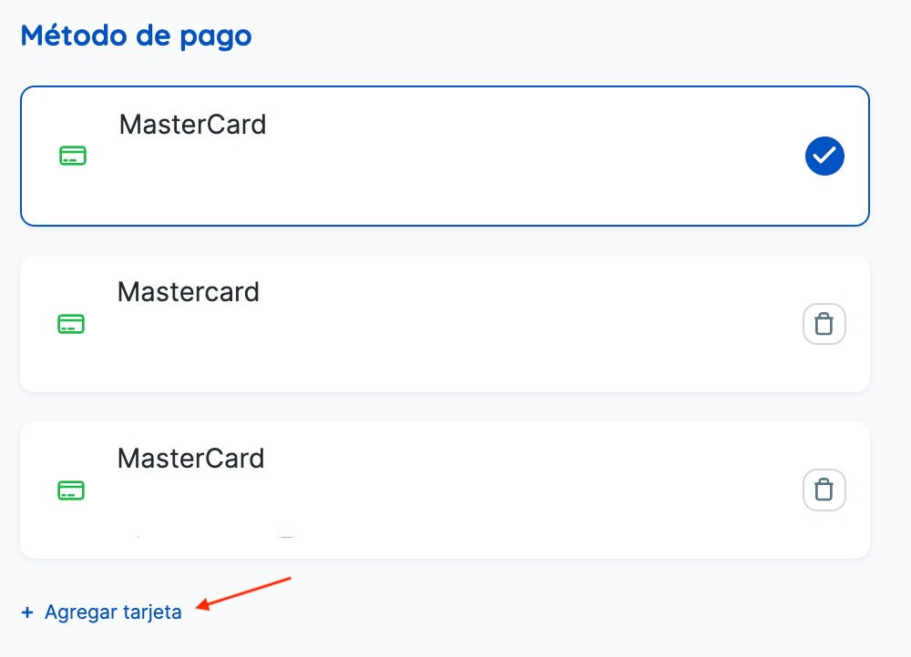 En esta parte también puedes actualizar la tarjeta predeterminada para los pagos de tu suscripción haciendo clic en la tarjeta que deseas establecer como predeterminada