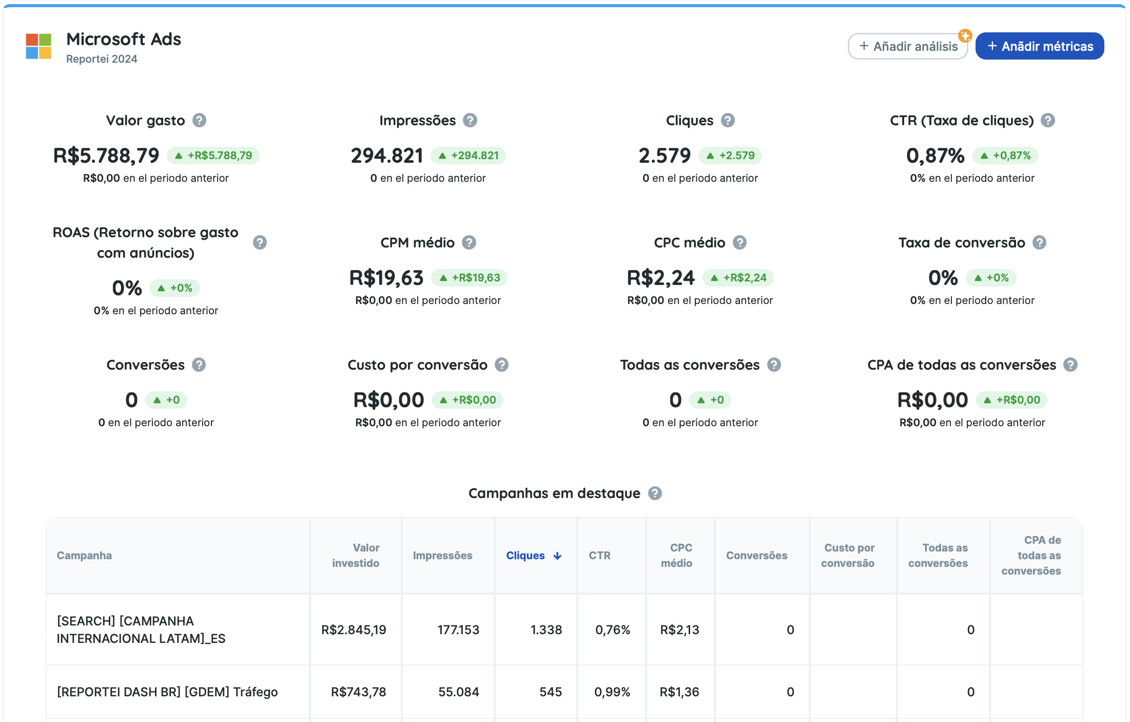 Sigue el rendimiento de tus campañas con los informes y paneles de Microsoft Ads de Reportei