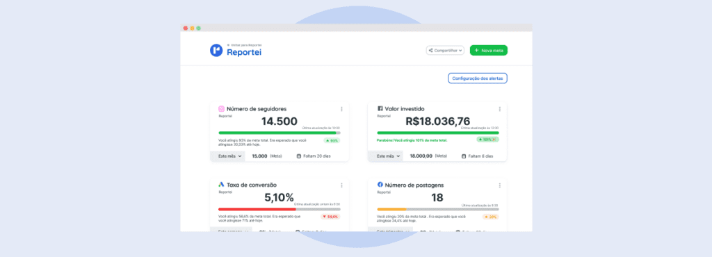 Découvrez Reportei Controle, notre outil de contrôle des indicateurs qui vous aide à analyser et à atteindre vos objectifs de marketing numérique avec plus de précision.