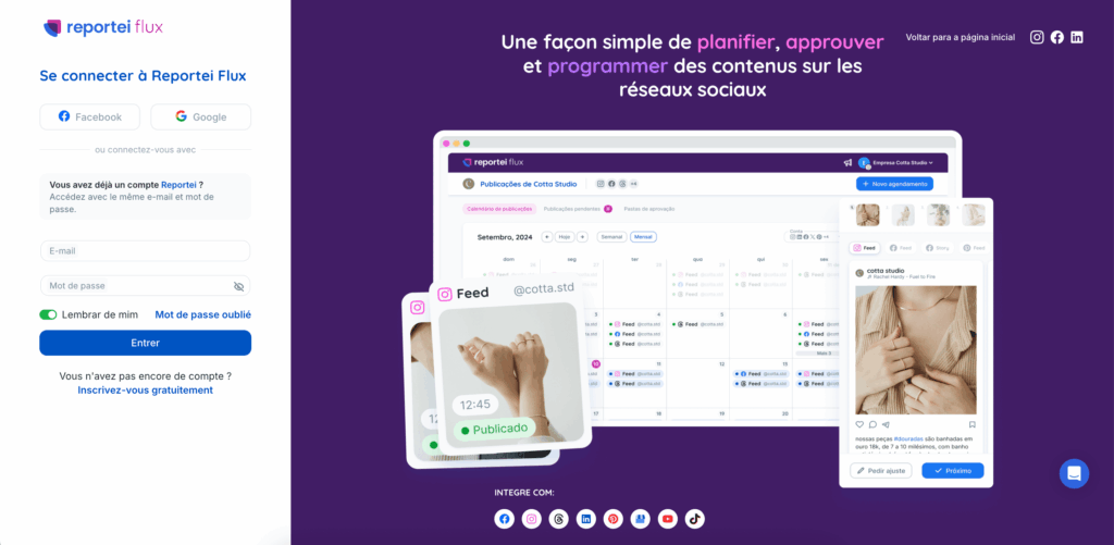 Accédez à la page du Reportei Flux et inscrivez-vous ou connectez-vous avec le même email et mot de passe que votre compte Reportei.
