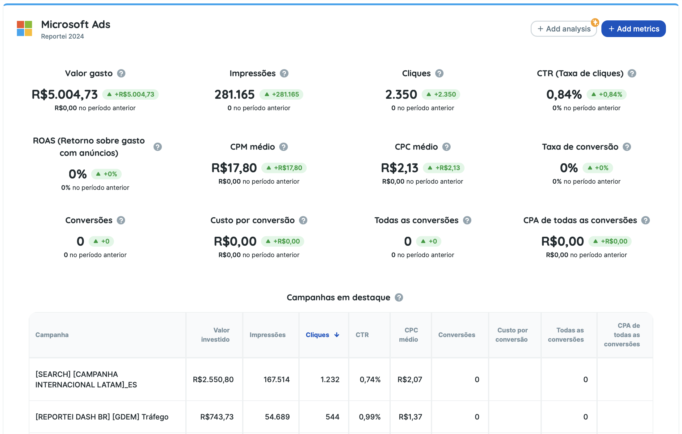 Acompanhe a performance das suas campanhas com os relatórios e dashboards do Microsoft Ads do Reportei